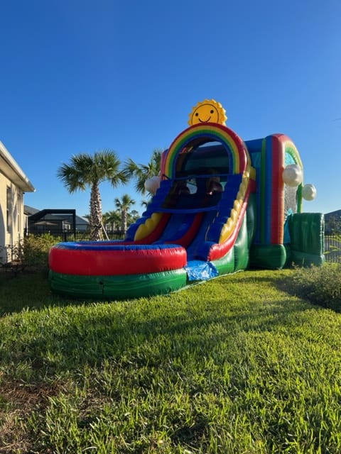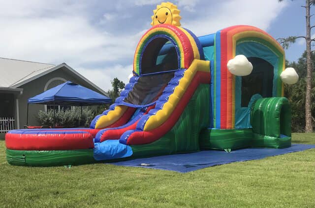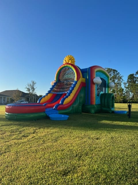 Your party is sure to shine with our Sunshine Combo Bounce House. With an attached dual lane slide, and a bounce house with basketball hoop, its sure to be a hit at your next party.