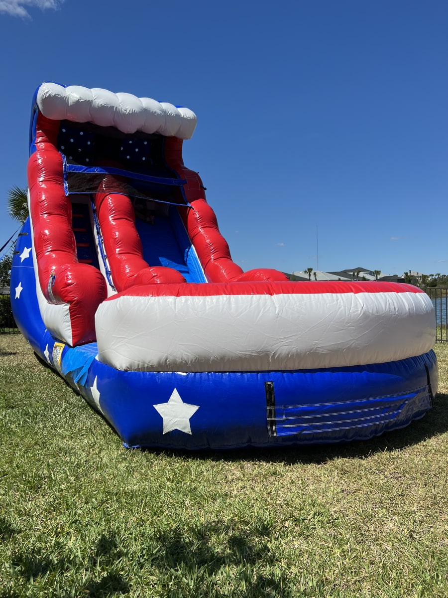 Slide down our newest addition, the Patriot Slide! This 16 foot tall water slide is sure to be a hit at your next party! With its awesome red white and blue color scheme along with stars, it is sure to stand out no matter what your events theme is.